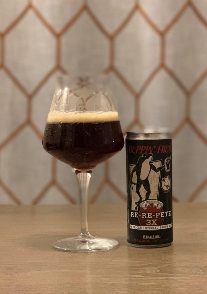 Tonight I’m so excited to have Hoppin’ Frog’s Re-Re-Pete. This is an Imperial Brown Ale brewed with Pete Slosberg from Pete’s Wicked Ale. This is a kicked up version of Pete’s Wicked checking in at 15.6% ABV and put out in an 8.45 oz can.