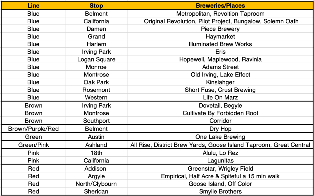 Here are some of the breweries in the city that are walking distance to public transportation (The EL) when you are in Chicago. If there is an addition I missed, feel free to let me know.